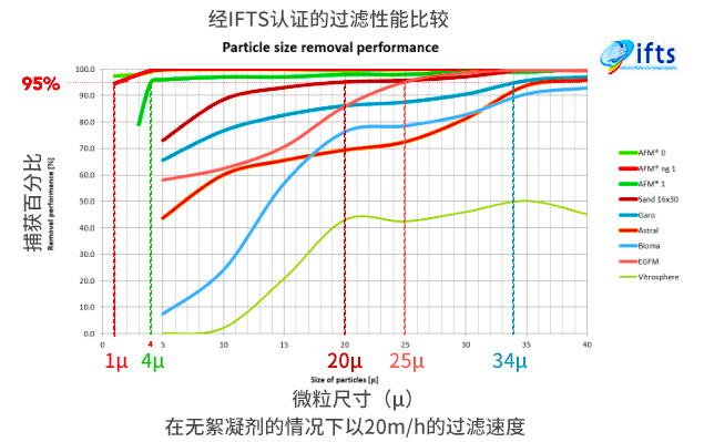 與石英砂相比,AFM濾料具有更好的過濾性能。當過濾速度為20m/h時,無需絮凝即可完成5微米的過濾。在實際應用中,AFM的過濾效率比石英砂和玻璃砂至少高30%。經APF和ZPM處理后的絮凝和凝聚,可達到0.1微米的過濾效果。